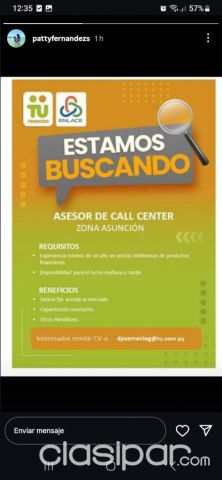 Ingresá a Clasipar.com. El Clasificado en Paraguay Asesores Clasipar.com Comerciales Fuente del anuncio:https://clasipar.paraguay.com/empleos/call-center/asesores-comerciales-2840601