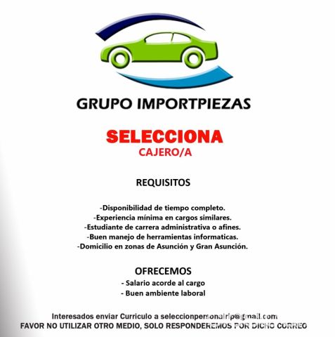 Favor remitir CV al correo seleccionpersonalrip@gmail.com Fuente del anuncio:https://clasipar.paraguay.com/empleos/otros-empleos/cajeroa-administrativoa-2892790