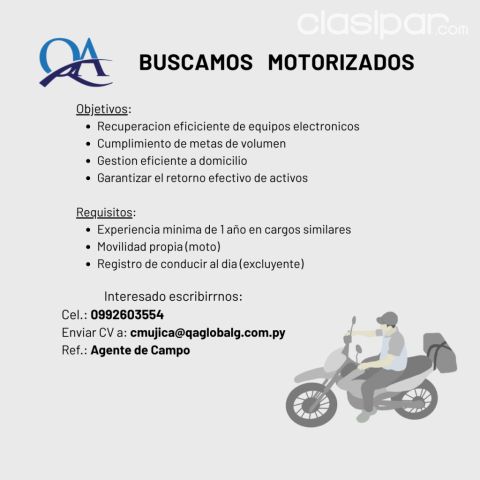 * EXPERIENCIA MINIMA DE UN AÑO COMO REALIZANDO Clasipar.com en Paraguay TRABAJO EN RUTA, DELIVERY, GESTOR, ETC Fuente del anuncio:https://clasipar.paraguay.com/empleos/otros-empleos/motorizado-2870916