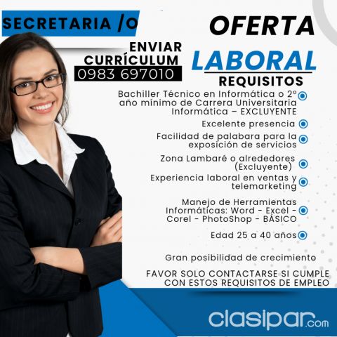 Detalle de: Comprá y vendé autos, inmuebles y electrónica. Busco El mejor clasificado de Paraguay. Ingresa a Clasipar! secretaria Fuente del anuncio:https://clasipar.paraguay.com/empleos/secretaria/busco-secretaria-2865530