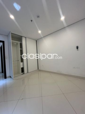 * Habitación principal con mueble para maquillaje y rack para TV con cajonera