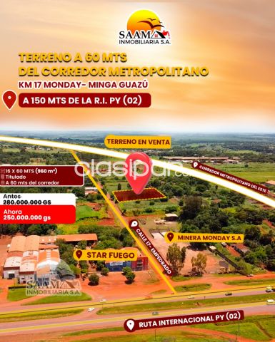 Este terreno se encuentra a solo 60 metros del Nuevo Corredor Metropolitano del Este, una importante arteria de conexión entre el Puente de la Integración y las ciudades de Presidente Franco, Ciudad del Este y Minga Guazú.