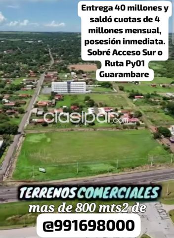 Entrega de 40 millones y cuotas corridas de 4 millones en 130 meses sin reajustes y posesión inmediata Fuente del anuncio:https://clasipar.paraguay.com/inmuebles/terrenos/en-venta-terrenos-comerciales-de-800mts2-sobre-acceso-sur-o-ruta-py-1-entrega-y-sorridas-2877436