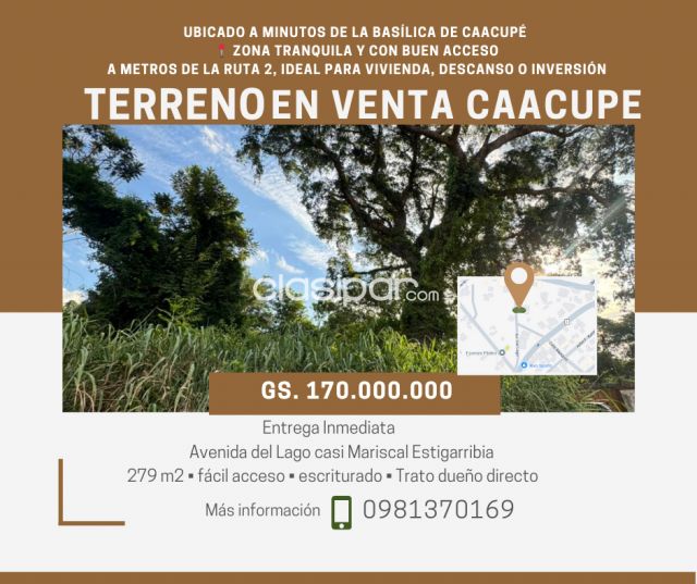 Ingresá a Clasipar! anuncios gratuitos Terreno ubicado Clasipar.com en Paraguay en Caacupé a 900 metros de la Basílica y a media cuadra la ruta 2. Posee 279 mts2 unicado en una zona tranquila, ideal para vivienda, descanso o inversión, trato directo con el dueño - precio: 170.000.000 millones - dirreccion exacta: Avenida del Lago casi Mariscal Estigarribia Fuente del anuncio:https://clasipar.paraguay.com/inmuebles/terrenos/vendo-terreno-en-caacupe-2893885
