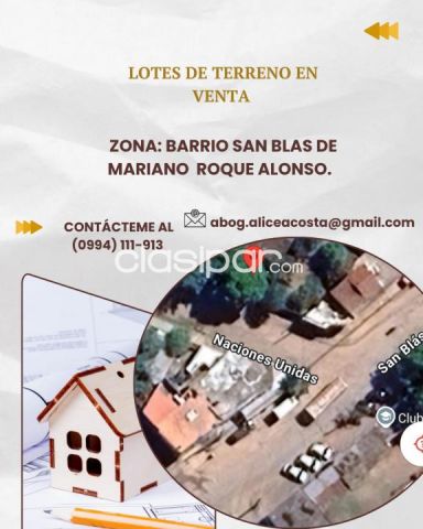 Email:abog.aliceacosta@gmail.com Fuente del anuncio:https://clasipar.paraguay.com/inmuebles/terrenos/venta-de-dos-lotes-de-terreno-en-mariano-roque-alonso-barrio-san-blas-2830583