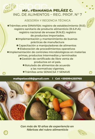 8. Trámites ante SENACSA y SENAVE Fuente del anuncio:https://clasipar.paraguay.com/servicios/oficios-tecnicos-profesionales/asesoria-y-regencia-tecnica-alimentaria-2884120