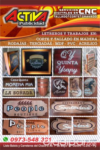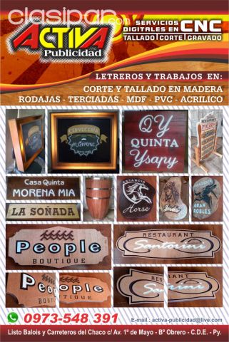 Servicio de Corte, Los mejores anuncios clasificados de Motos los encontrás en Clasipar.com Grabado y Tallados en Maquinas CNC Router sobre materiales de Madera liso, Terciadas, MDF, PVC, Acrílicos y Rollos de Troncos, para fabricación de Carteles, Letras Corporeas, Grabados de Logos etc.